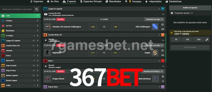 O 367Bet oferece uma grande seleção de opções de apostas em e-sports com probabilidades competitivas